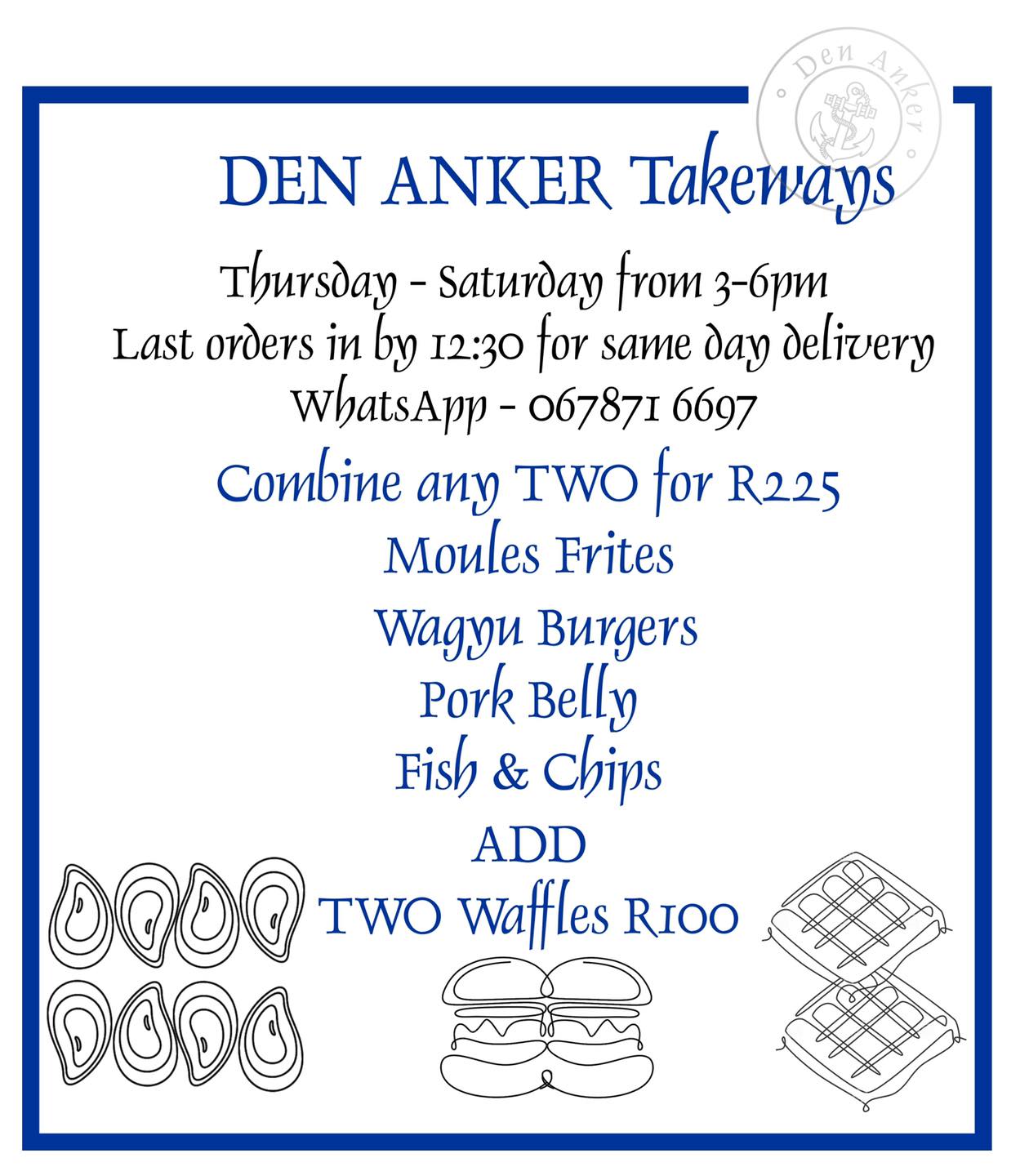 Send Den Anker a What’s app on 067 871 6697 to order your takeaways and they will bring them to you.