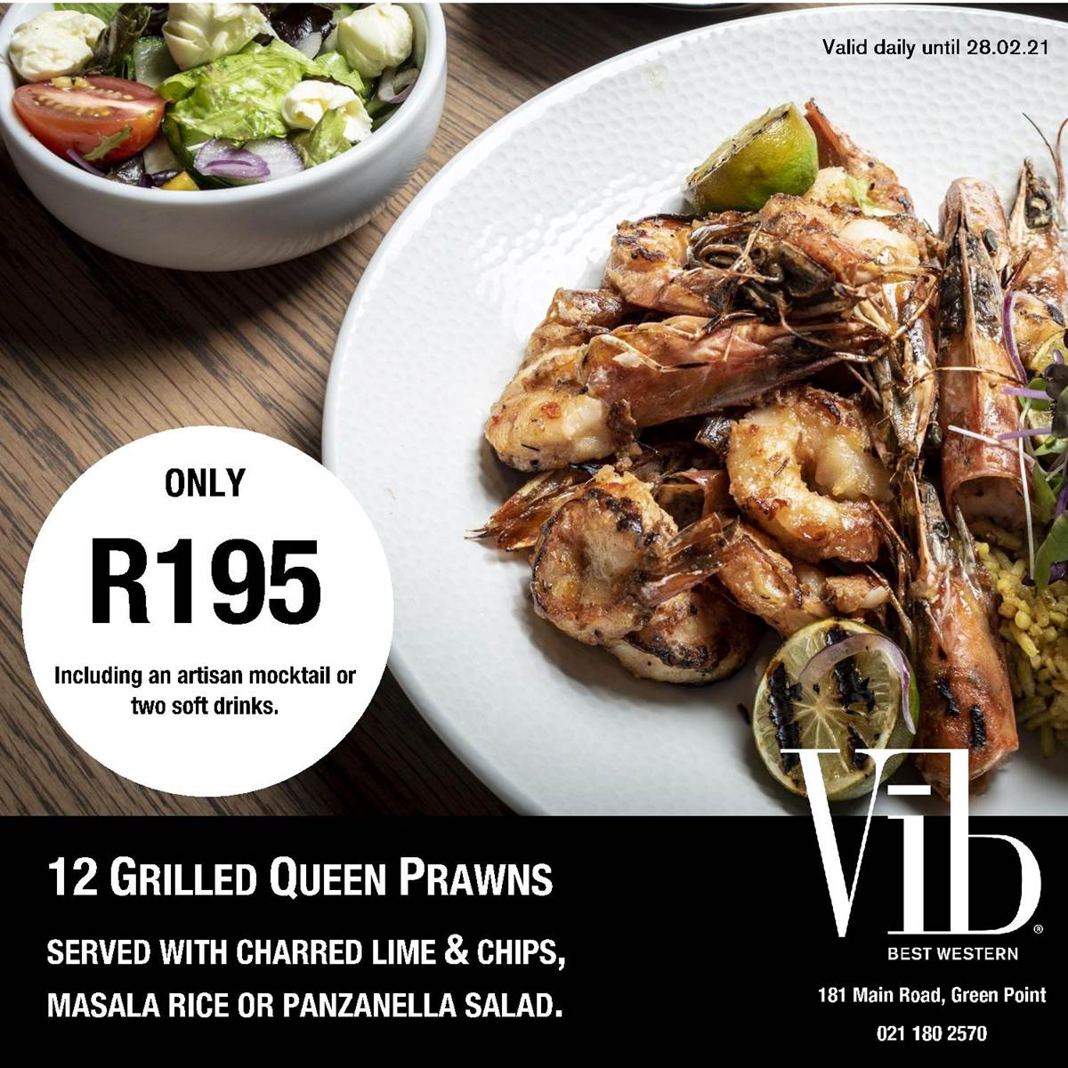 For lunch or dinner from now until 28 February 2021, diners can enjoy 12 grilled queen prawns served with charred lime and your choice of chips, masala rice or panzanella salad.