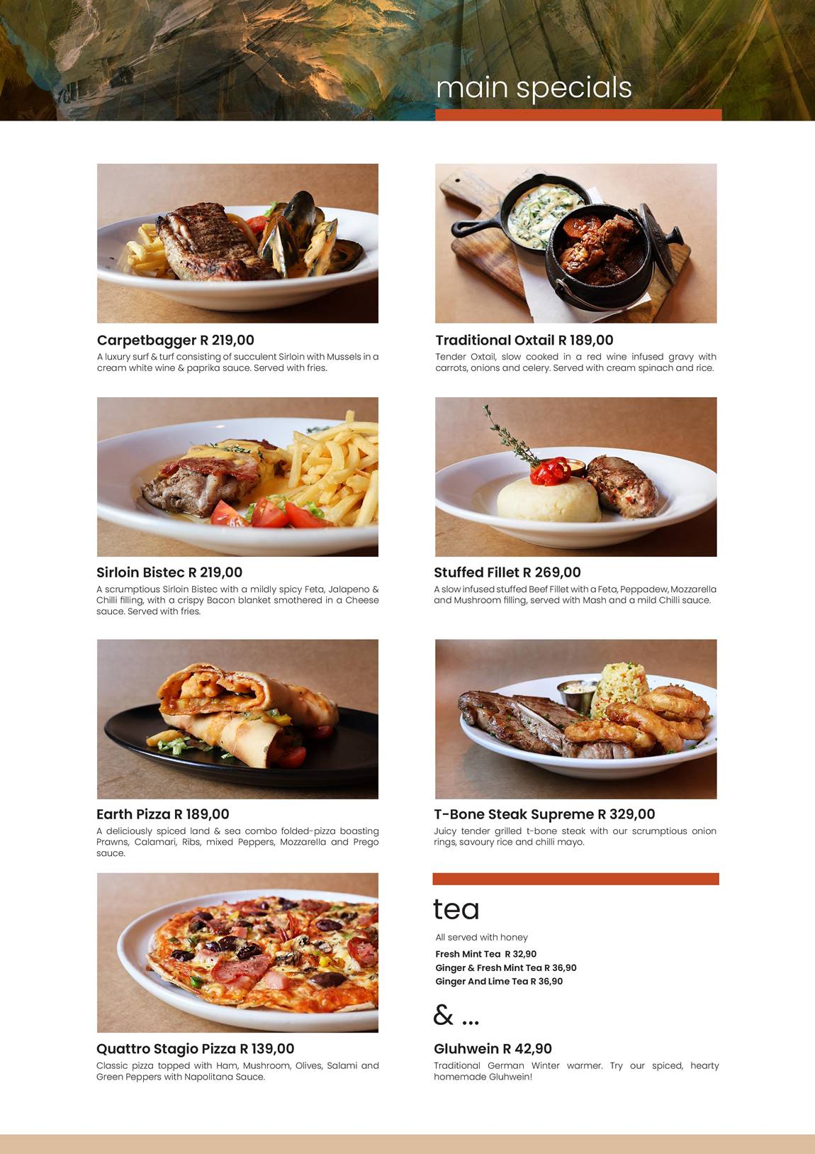 One of the stars of the menu is the Carpetbagger. This luxurious surf and turf features succulent sirloin paired with mussels, all swimming in a creamy white wine and paprika sauce, and is served alongside crispy fries, priced at R219. For a robust, home-style meal, their Traditional Oxtail is a clear winner. Slow-cooked to perfection, the tender oxtail is bathed in a rich, red wine-infused gravy, accompanied by carrots, onions, celery, cream spinach, and rice, all for R189.