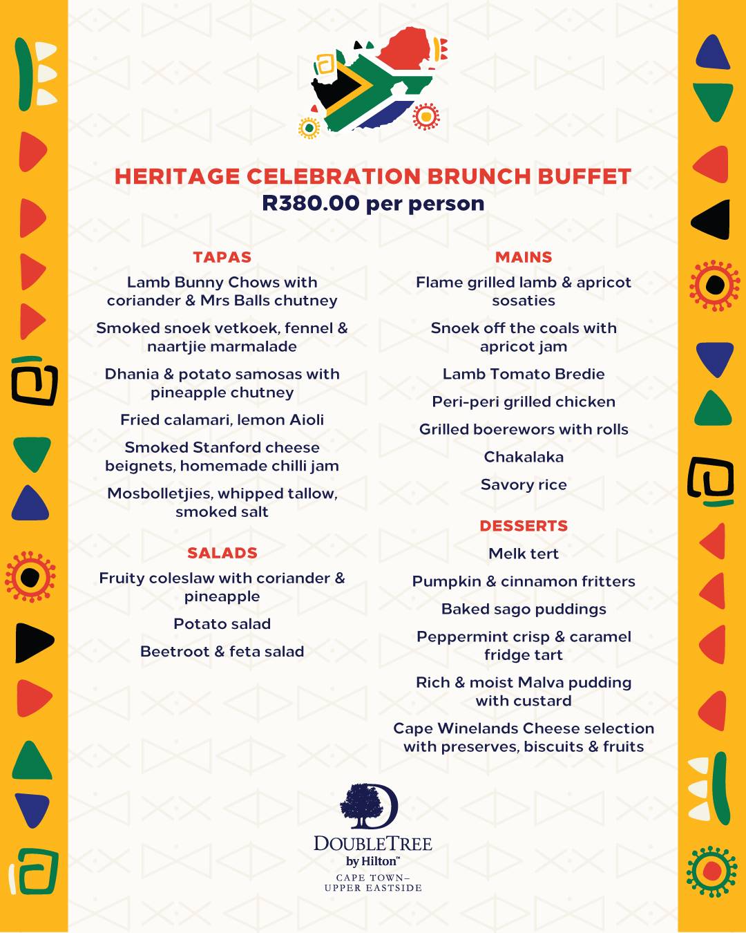 - The menu for the Heritage Celebration Brunch Buffet is a true reflection of South Africa’s diverse culinary heritage.[full menu]