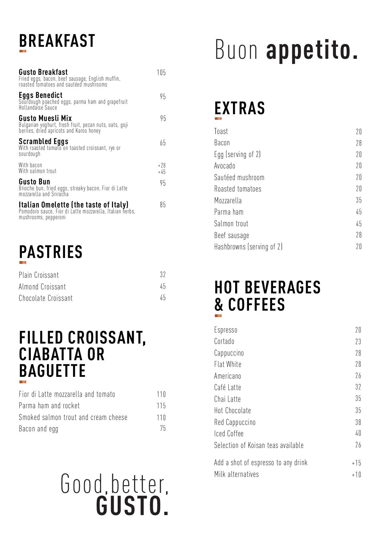 - For a truly unforgettable breakfast experience, sink your teeth into the Gusto Bun. This mouthwatering creation features a brioche bun filled with fried eggs, streaky bacon, Fior di Latte mozzarella, and a hint of Sriracha. Prepare to be blown away by the explosion of flavors in each bite.