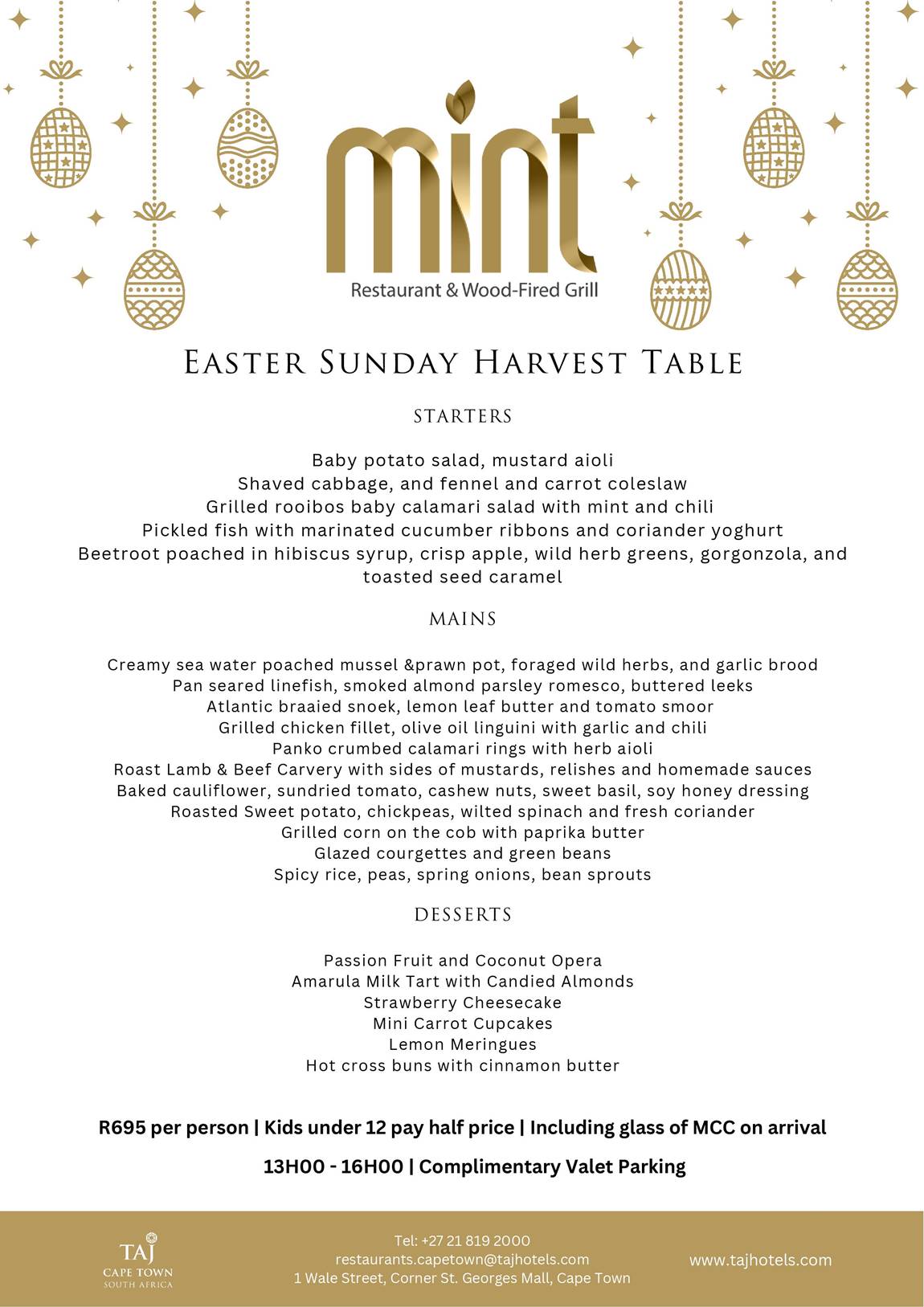Taj Cape Town is offering an Easter Sunday Harvest Table at their Mint Restaurant and Wood-Fired Grill, featuring a delectable array of dishes that are sure to tantalize your taste buds.