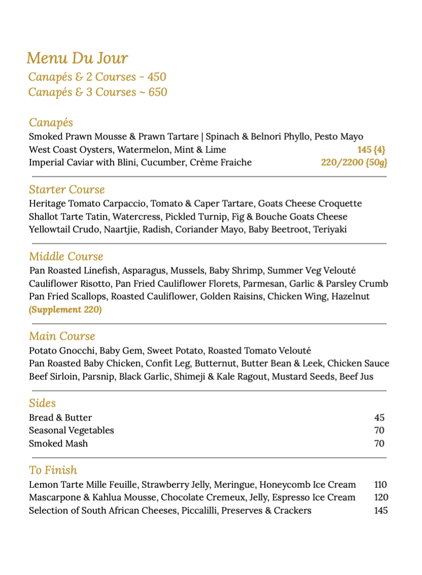 For just R450, indulge in canapés and two fine dining courses, or for a more indulgent experience, opt for canapés and three courses for just R650.