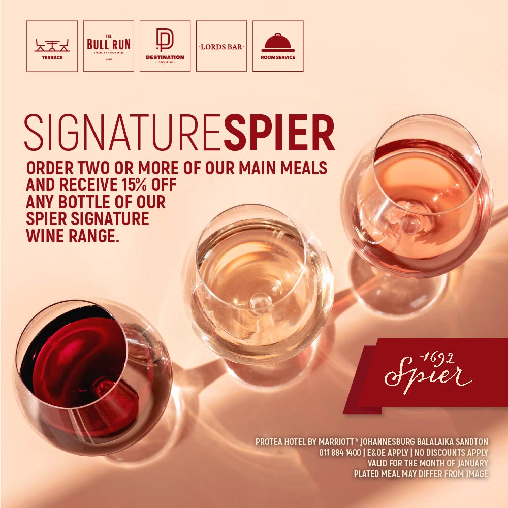 This exclusive promotion invites patrons to enjoy a 15% discount on any bottle from the esteemed Spier Signature Wine range when ordering two or more main meals.