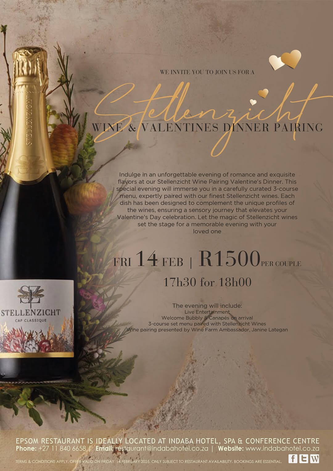 - For R1500 per couple, guests will be welcomed with a glass of bubbly and delectable canapés to set the tone for a magical evening. The highlight of the night is a sumptuous three-course dinner, carefully paired with exquisite Stellenzicht wines to elevate every bite.