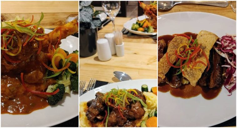 - Braised Lamb Shank with garlic and rosemary on mashed potatoes and seasonal vegetables for R205.