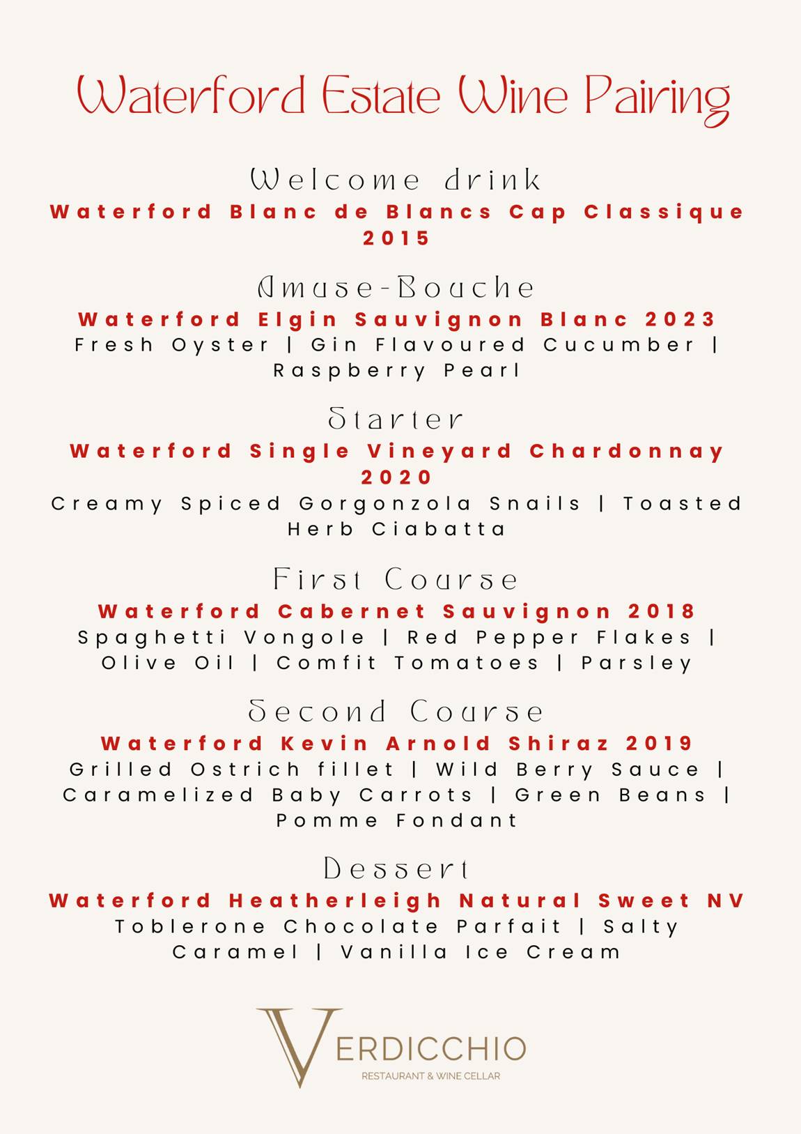 - Featuring delicacies such as fresh oysters, creamy spiced gorgonzola snails, spaghetti vongole, and succulent grilled ostrich fillet. Each dish will be thoughtfully paired with six exceptional wines from the renowned Waterford estate, enhancing the dining experience to unparalleled heights.