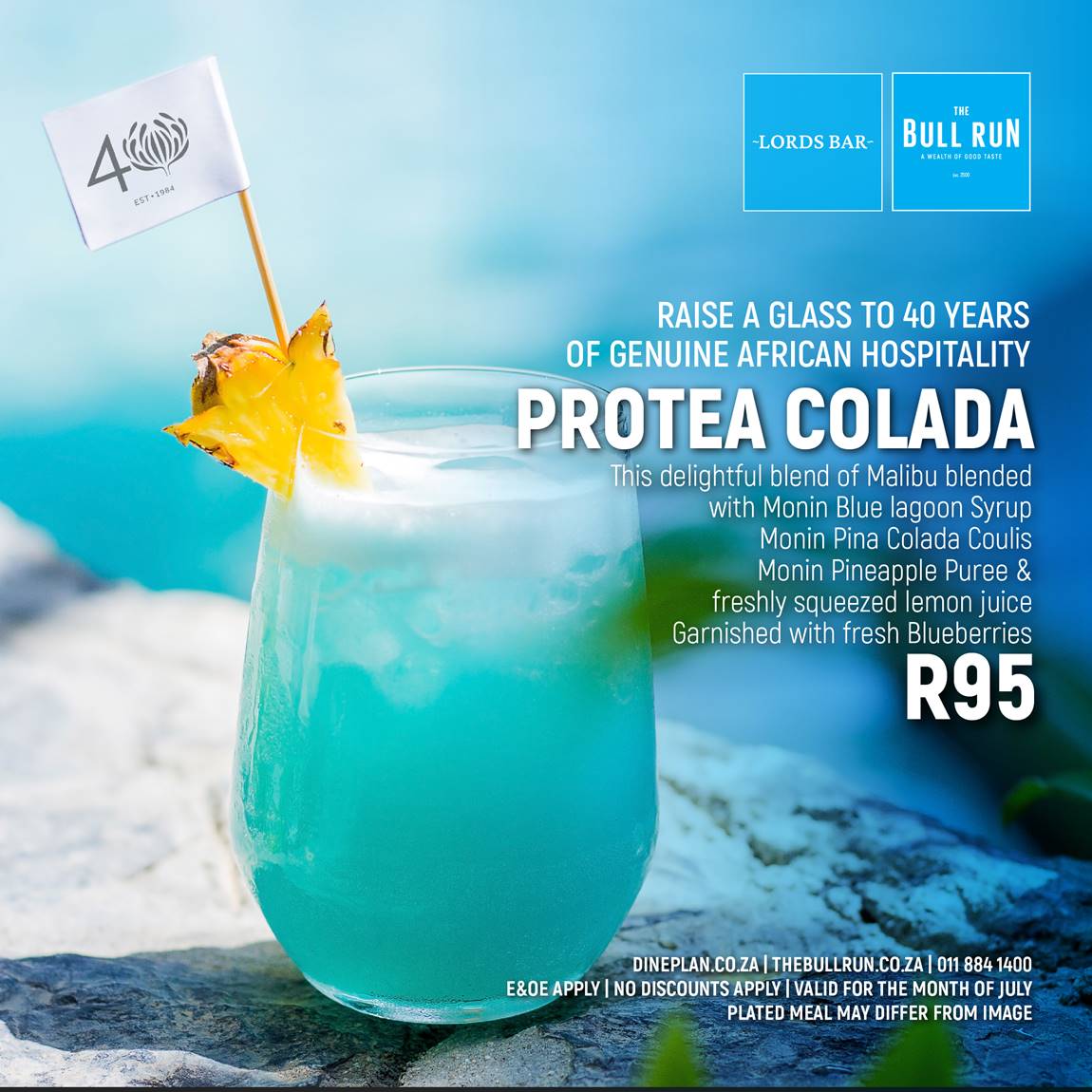 - Raise a glass to 40 years of geniune hospitality by enjoying a Protea Colada for R95 which is a delightful blend of Malibu, Monin Blue lagoon syrup, Monin Pina Colada Coulis, Monin Pineapple puree and freshly squeezed lemon juice available at Lords Bar & The Bull Run.