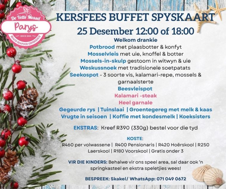 On 25 December, guests are invited to a Christmas Buffet like no other – packed with festive favourites, fresh-off-the-fire seafood, and that signature De Vette Mossel spirit. Choose between a laid-back lunch session at 12:00 or a relaxed dinner session at 18:00.