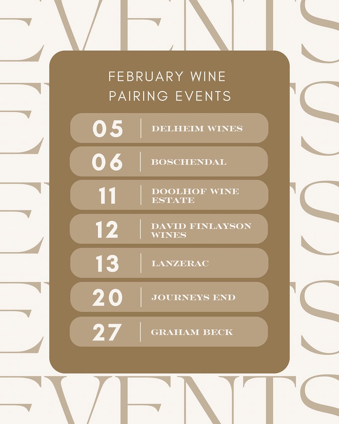 Each evening begins with a welcome drink, followed by a carefully curated selection of amuse-bouches, starters, and mains, each complemented by a handpicked wine from the featured estate. Expect mouthwatering pairings such as smoked salmon with marinated red onions and Delheim Wild Ferment Chenin Blanc or gratinated mussels with a herb and lime crust alongside Graham Beck Blanc de Blanc.