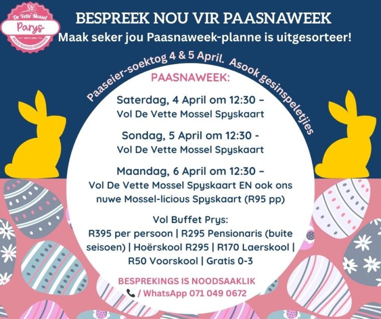 Expect plenty of seafood, generous portions, and a pace that encourages going back for more. This is not the kind of weekend you leave to chance. Bookings are essential, and for good reason. For anyone looking to keep Easter simple, social, and well-fed, De Vette Mossel Parys makes a strong case.