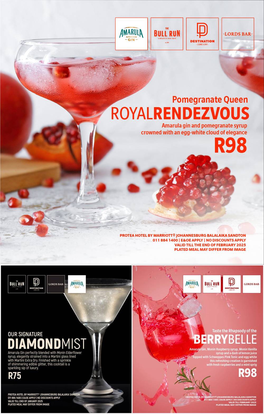 - For a refreshing twist, try the BerryBelle, a berry-forward delight made with Amarula gin, Monin raspberry and vanilla syrups, and a dash of lemon juice. Topped with Schweppes pink tonic and garnished with fresh raspberries and mint, this drink is a vibrant, eye-catching choice for R98.