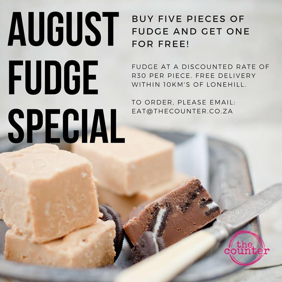 Until the end of August, buy five pieces of fudge at The Counter and get one for free. White chocolate and Dark Chocolate/Oreo fudge is up for grabs.To order, please e-mail eat@thecounter.co.za.