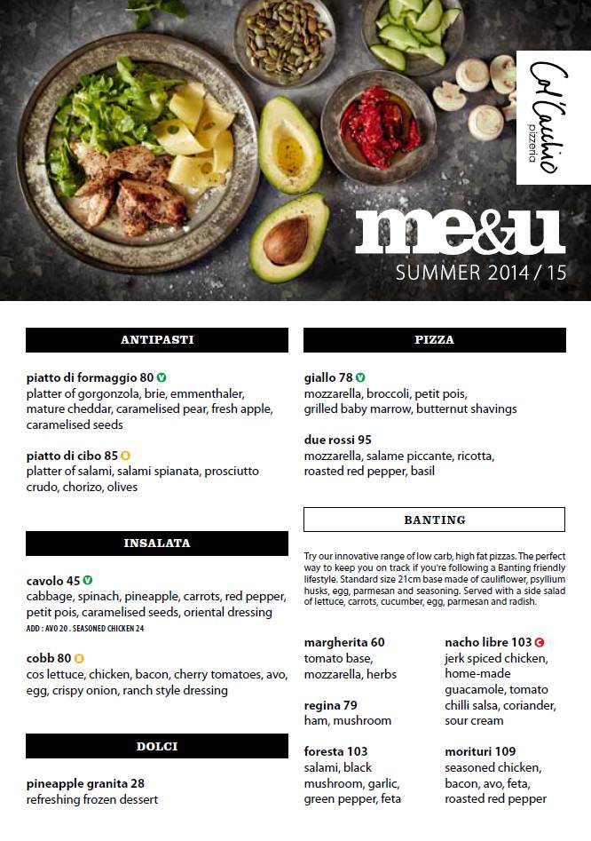 In addition to the exciting new Banting pizza range, Col’Cacchio pizzeria’s new summer menu offers customers innovative new antipasti dishes, delightful salads, pizzas, desserts and summertime cocktails.