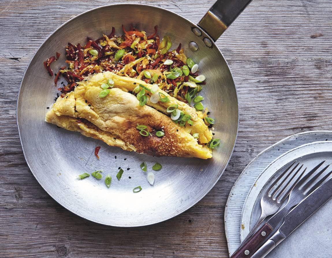 - Transfer the omelette to a plate, fill it with the cabbage mixture and some spring onions, then fold over the edges.