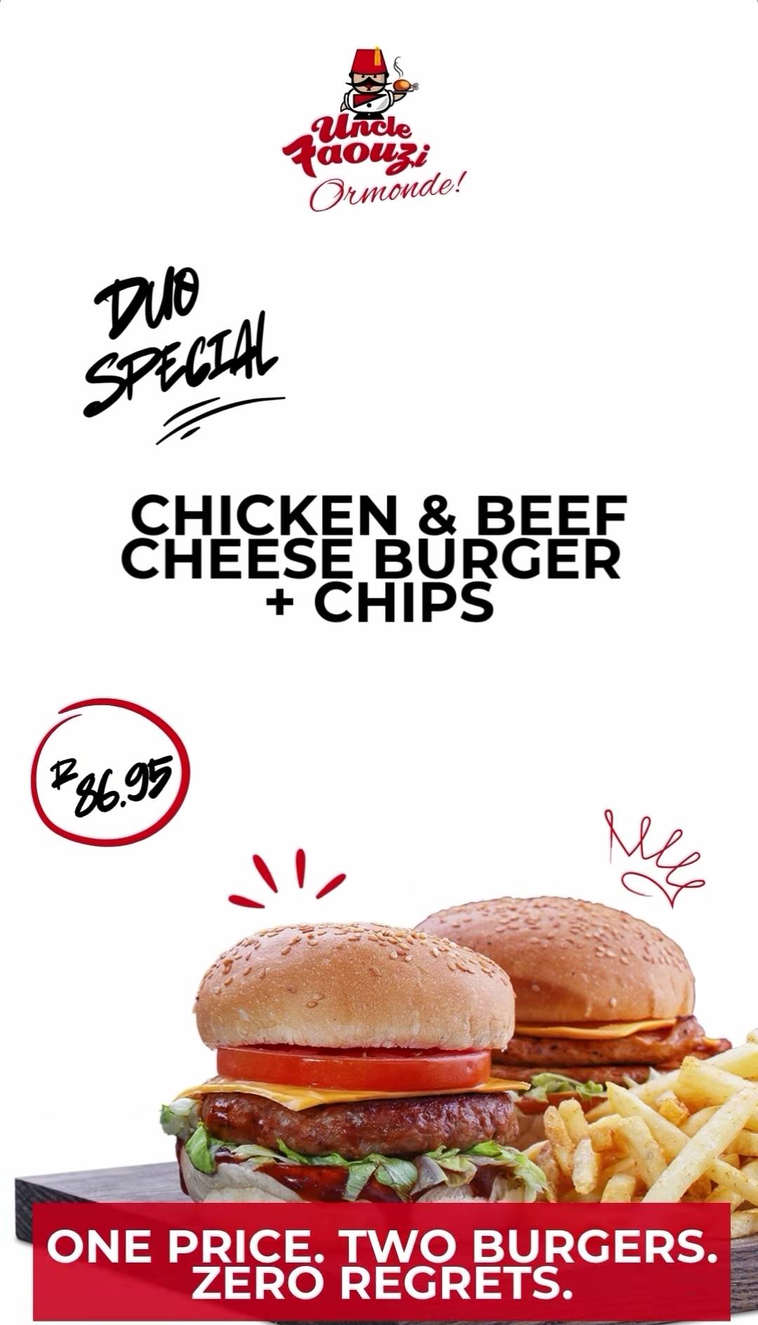 Introducing the Duo Special: a chicken cheeseburger, a beef cheeseburger, a pile of crispy golden chips, and a seriously unbeatable price—just R86.95.