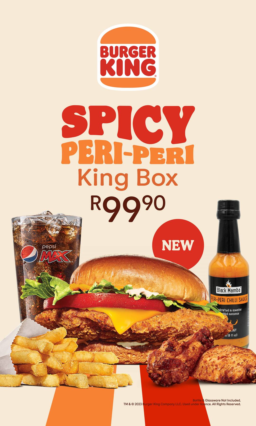The Spicy Peri-Peri range includes a variety of chicken burger meals plus an option to upgrade to a King Box and receive two crispy or original chicken wings with your combo.
