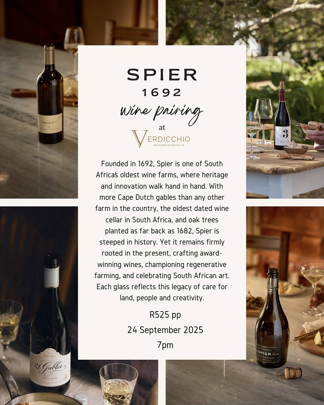 - With every bottle telling a story of land, people, and creativity, their wines are the perfect match for a Heritage Day celebration. Guests can look forward to a thoughtfully crafted menu where each dish is paired with a Spier wine selected to enhance the flavours and create a perfectly balanced dining journey. Expect elegance, innovation, and a showcase of South African produce elevated to new heights.