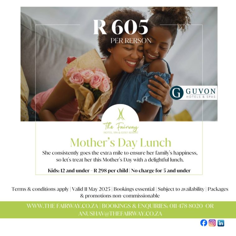 This exclusive offer is valid until on 11 May 2025, making it the perfect opportunity to plan ahead and secure your spot for a memorable day. Show Mom how much she means to you with a celebration at The Fairway Hotel. Bookings are essential, so visit www.thefairway.co.za or contact the team directly to make her day unforgettable.
