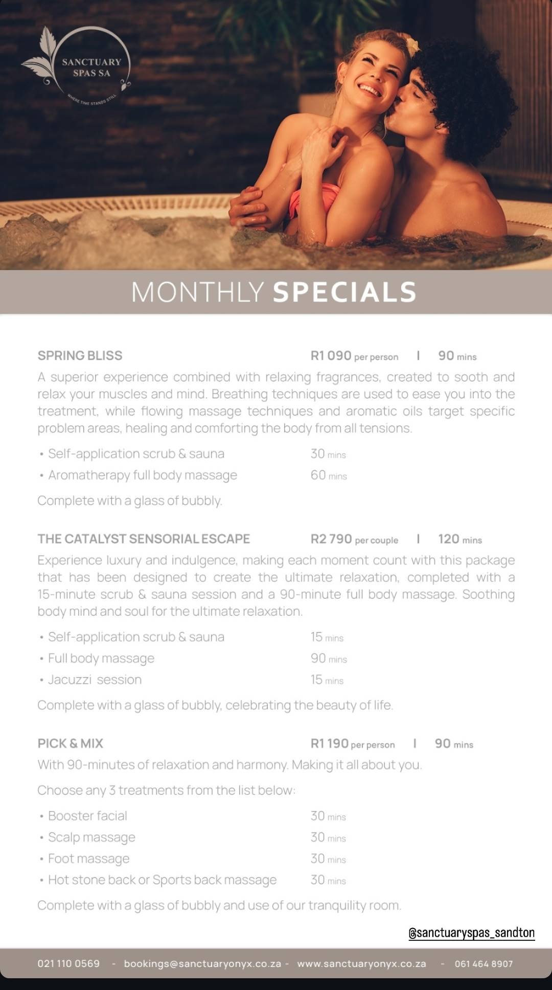 - Spring Bliss (R1,090 per person) is a 90-minute journey of pure tranquility. This package includes a 30-minute self-application scrub and sauna session, followed by a 60-minute aromatherapy full-body massage. Designed to melt away muscle tension and stress, the experience is complete with a complimentary glass of bubbly to sip while you relax.