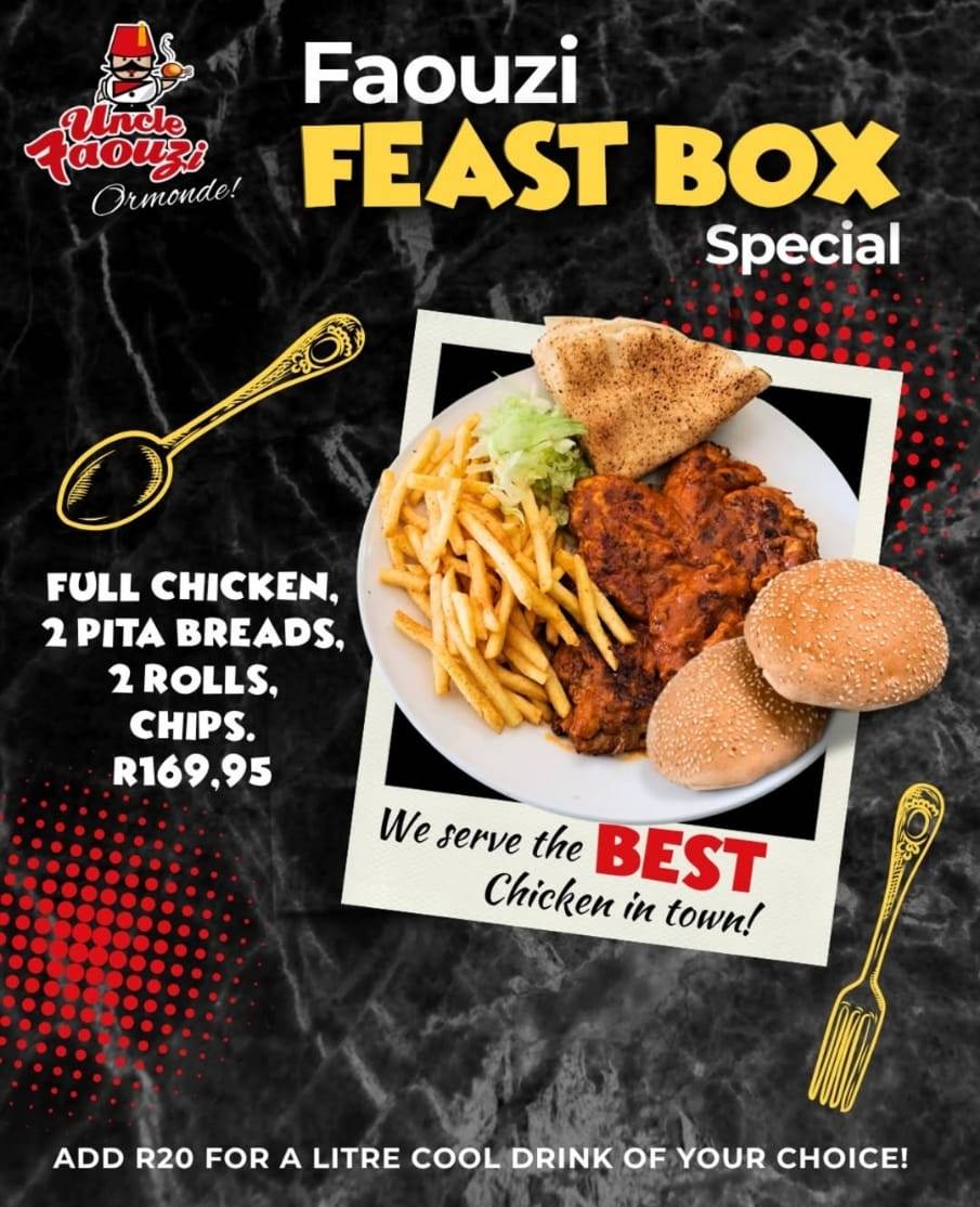 Introducing the Faouzi Feast Box Special: 🔥 Full Chicken 🔥 2 Pita Breads 🔥 2 Rolls 🔥 A mountain of chips. All for just R169.95.