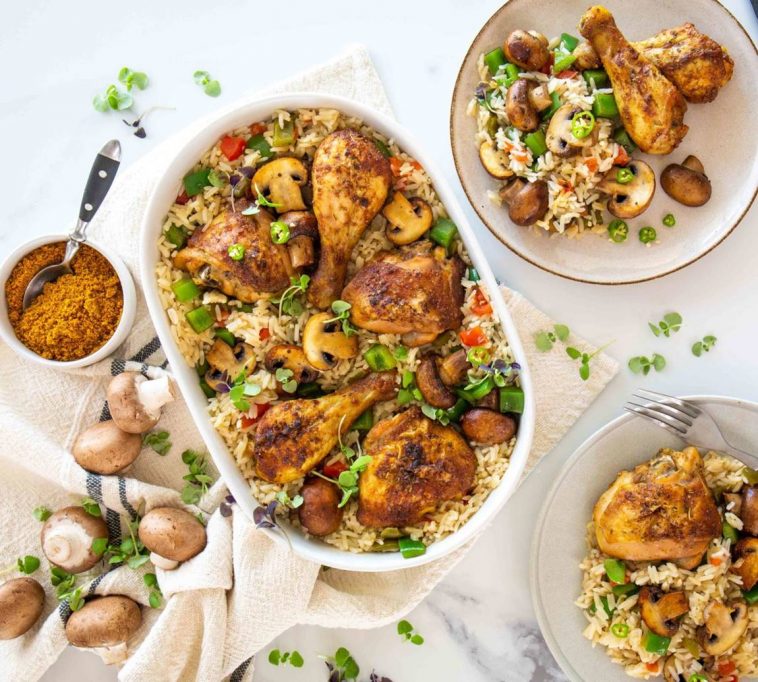 Cover with a lid (or tinfoil) and bake for 25 minutes. Remove the lid and bake for another 25 minutes until the rice is cooked and the chicken skin is golden and crisp.