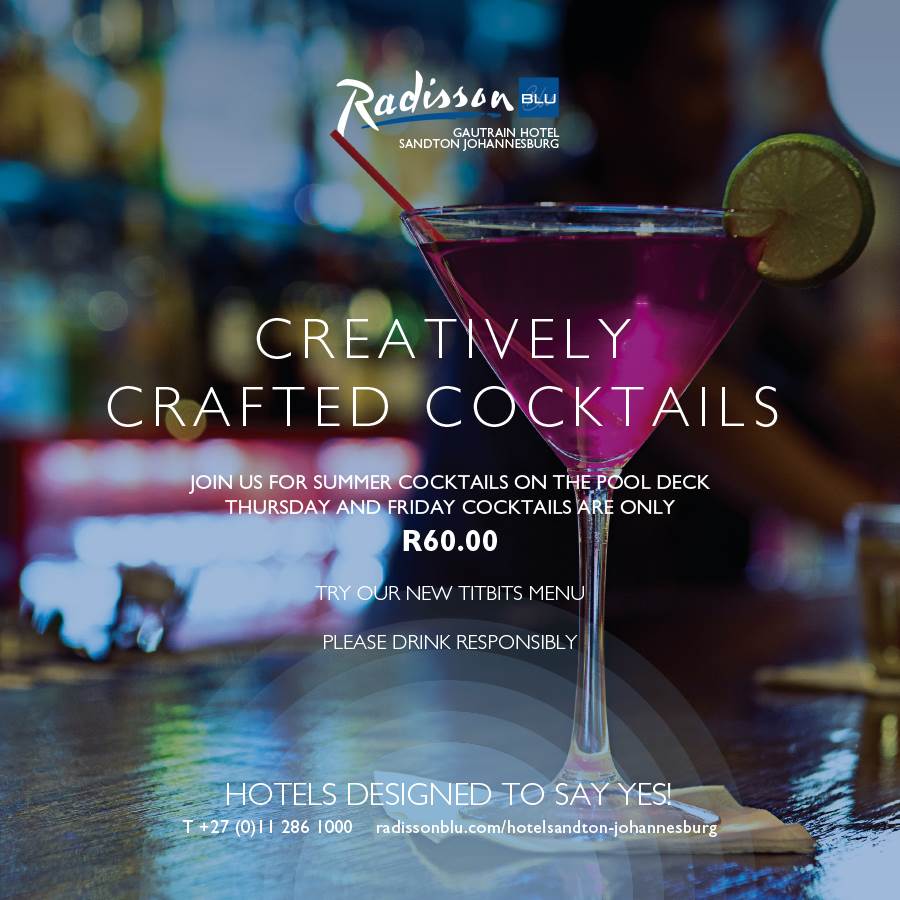 Join the Radisson Blu Gautrain Hotel in Sandton for summer cocktails on their beautiful pool deck every Thursday and Friday. On these two days, all cocktails are only R60, while a delicious titbits menu is also available to try.