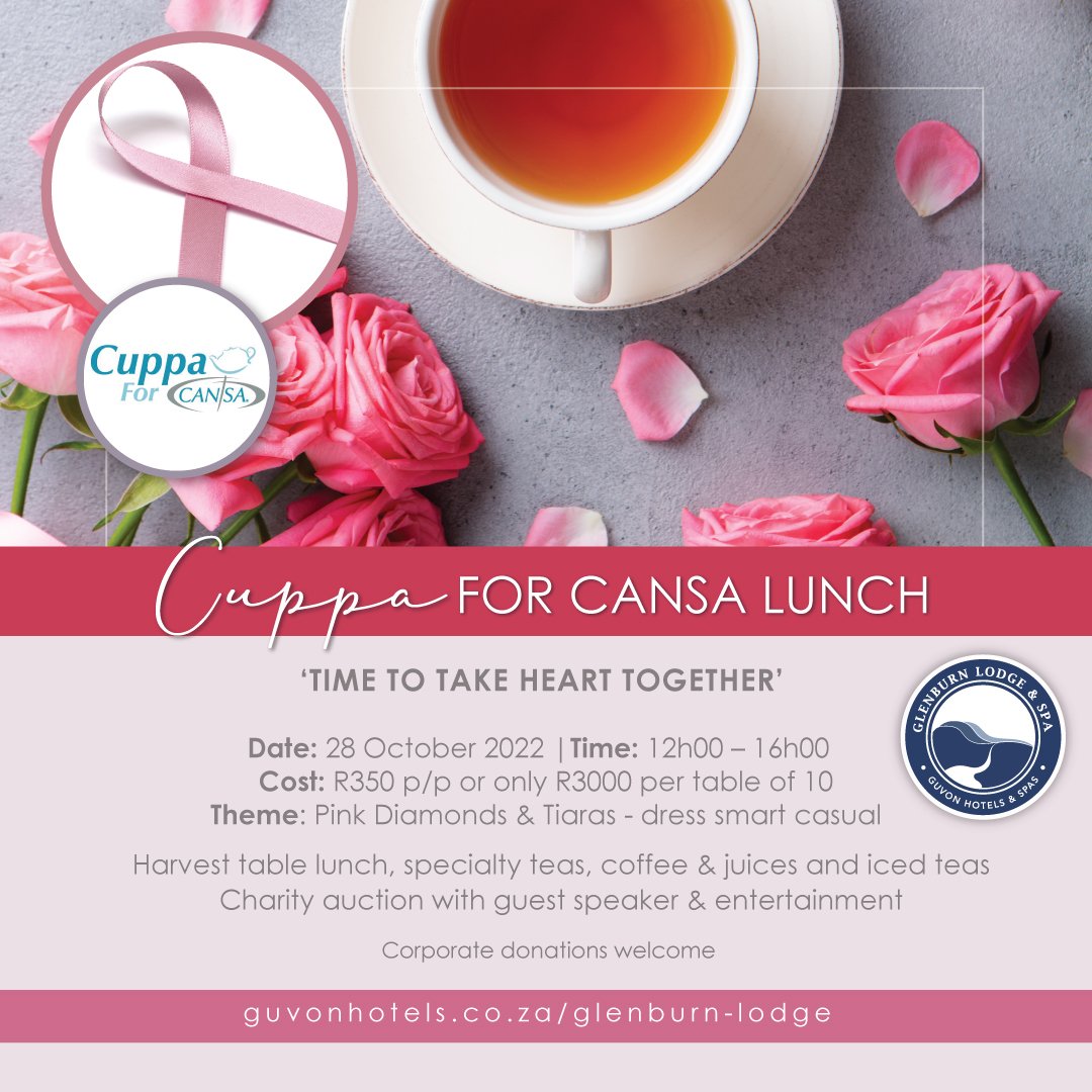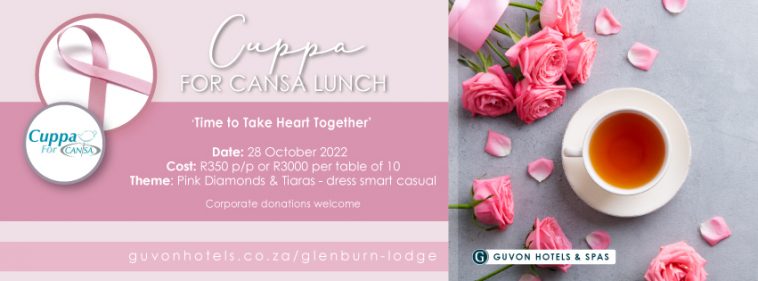 Glenburn Lodge is hosting a charity lunch to raise funds for CANSA. Guest will be treated to a delicious harvest table lunch, speciality tea, coffee, juice and iced teas. The theme of the afternoon is Pink Diamonds & Tiaras and the dress code is smart casual. There will be live entertainment and a charity auction.
