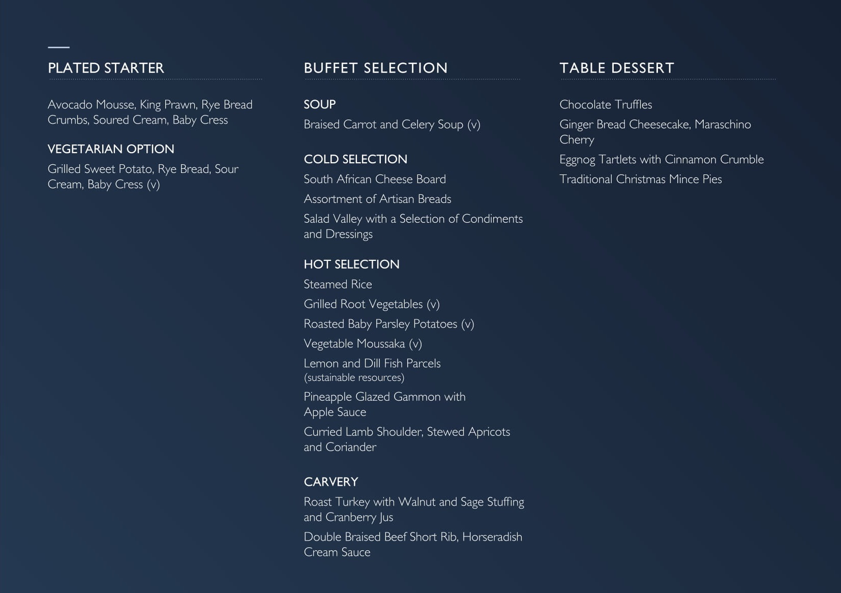 Or a lavish Christmas Day lunch buffet on 25 December at 12:30.