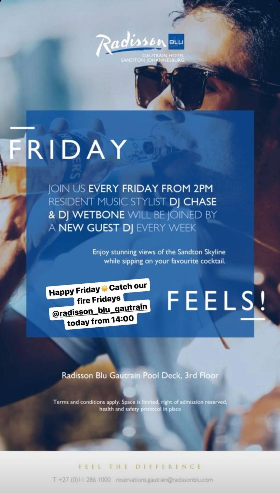 Every Friday, starting at 2 pm, the Radisson Blu Gautrain Pool Deck comes alive with the pulsating beats of resident music stylists DJ Chase and DJ Wetbone.