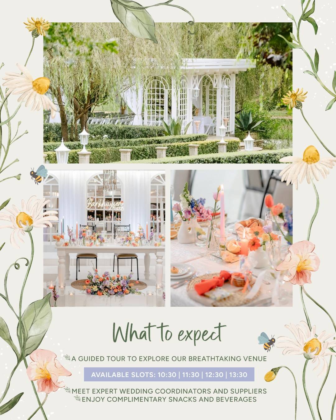 🌿 Guided venue tours of the gorgeous estate (with serious “I do” energy)