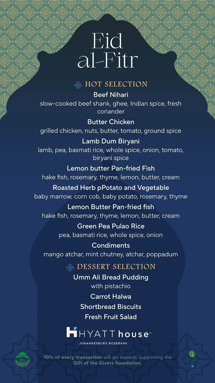 Priced at R495 per person, the Eid al-Fitr buffet also carries a meaningful touch: 10% of every transaction goes towards supporting the Gift of the Givers Foundation, adding heart to an already generous celebration.