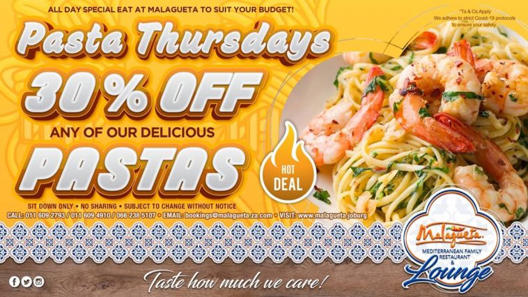 Enjoy a delicious Pasta Special every Thursday at Malagueta