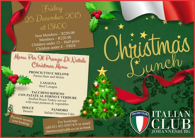 Il Terrazzo Ristorante at the Italian Club Johannesburg will be offering a stunning 5 course lunch menu on the 25th of December for only R250. There are also special prices for kids with the entire family welcome to join. Parma ham, lasagna, turkey, dessert and cake is on the menu. Make sure there is enough room when you arrive.