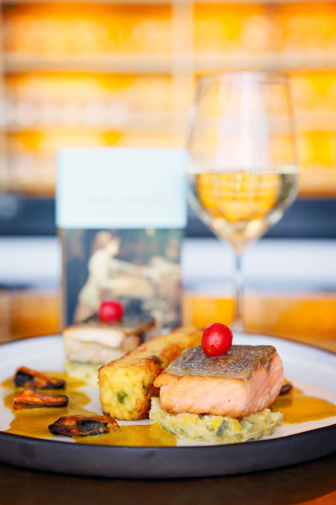 With a duo of fish – Scottish Salmon from the North and Sea Bass from the South – this delicious main course will not disappoint. The fish is served with a leek compote, compressed saffron risotto, sweet peas and blue mussel sauce.