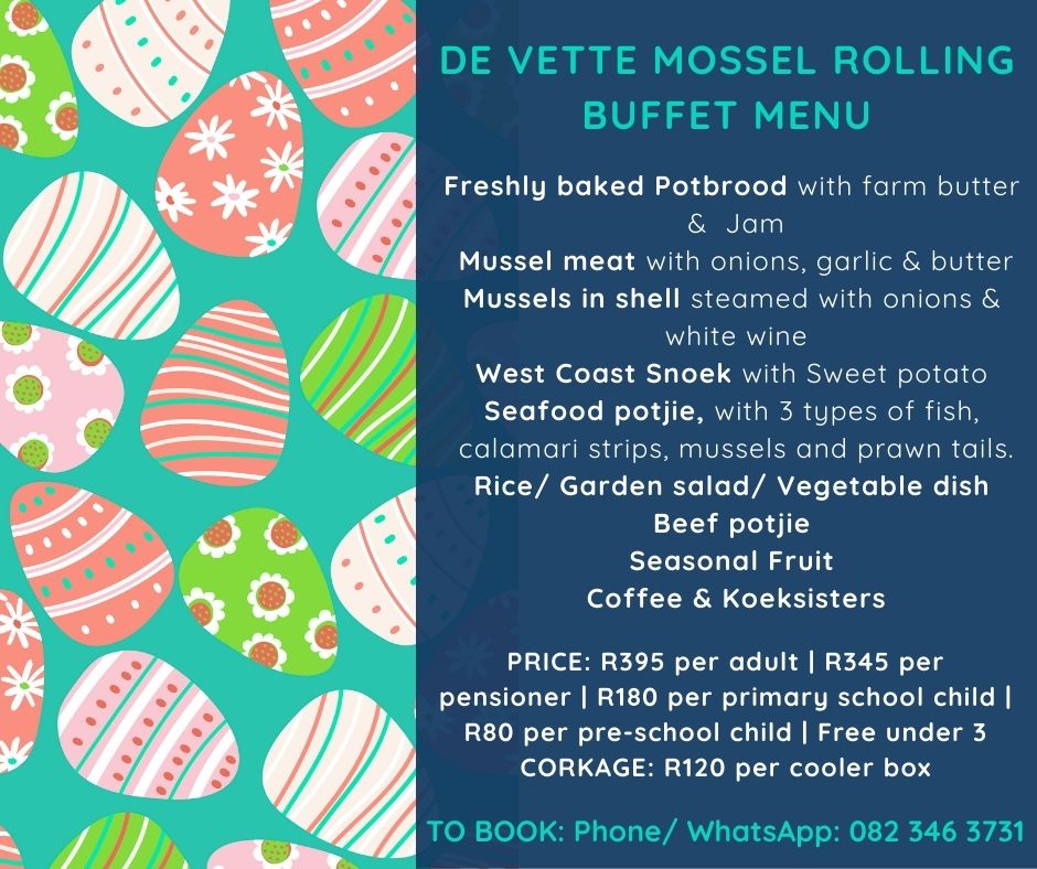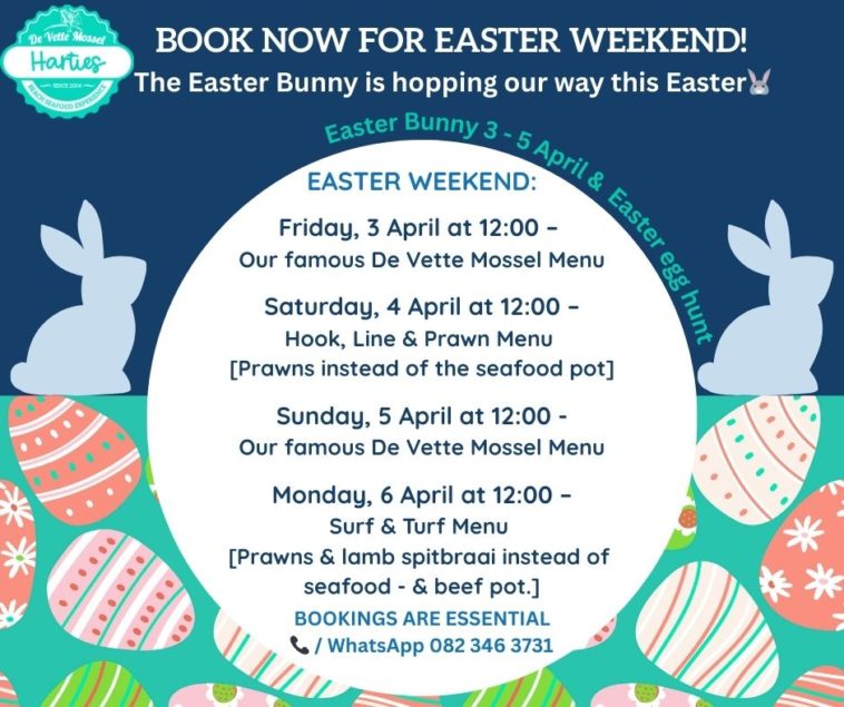 At De Vette Mossel Harties, Easter is not just one lunch. It is a full long weekend of food, family, and a bit of fun, all starting at 12:00 each day from 3 to 6 April.
