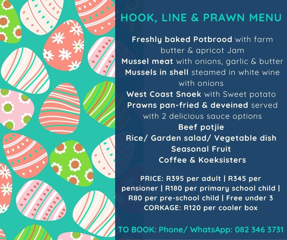 - Monday (6 April): Surf & Turf, with prawns and lamb spitbraai taking centre stage