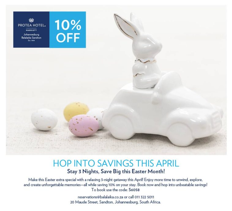 Need a little escape this April? The Protea Hotel by Marriott Johannesburg Balalaika Sandton is making it easier than ever to press pause and indulge in a well-earned break—with a side of Easter charm and a 10% saving to sweeten the deal.
