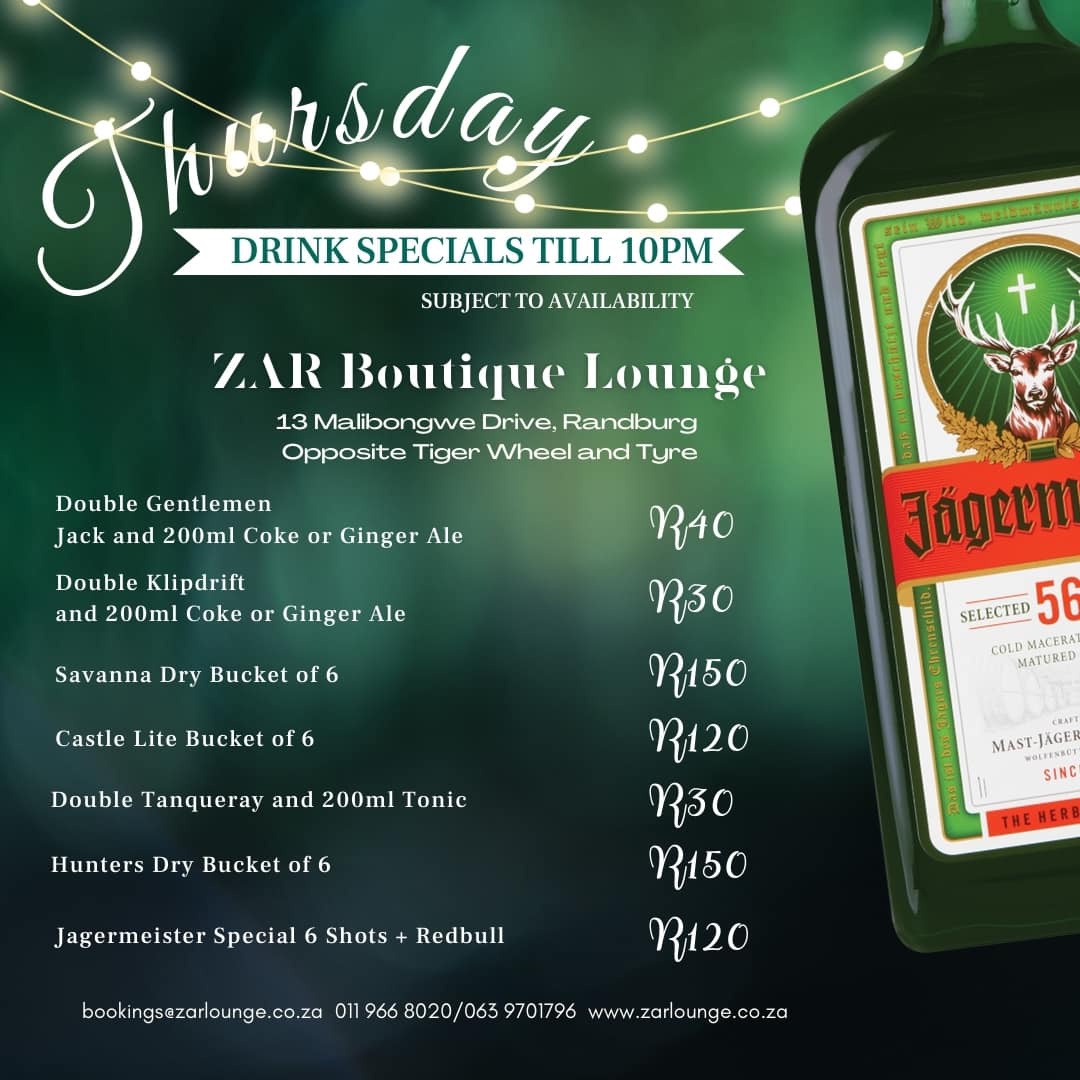 Don’t miss out on the daily specials and special event opportunities at ZAR Boutique Lounge. Contact them at 011 966 8020, WhatsApp at 0639701796, or email bookings@zarlounge.co.za to make your reservation or enquiry.