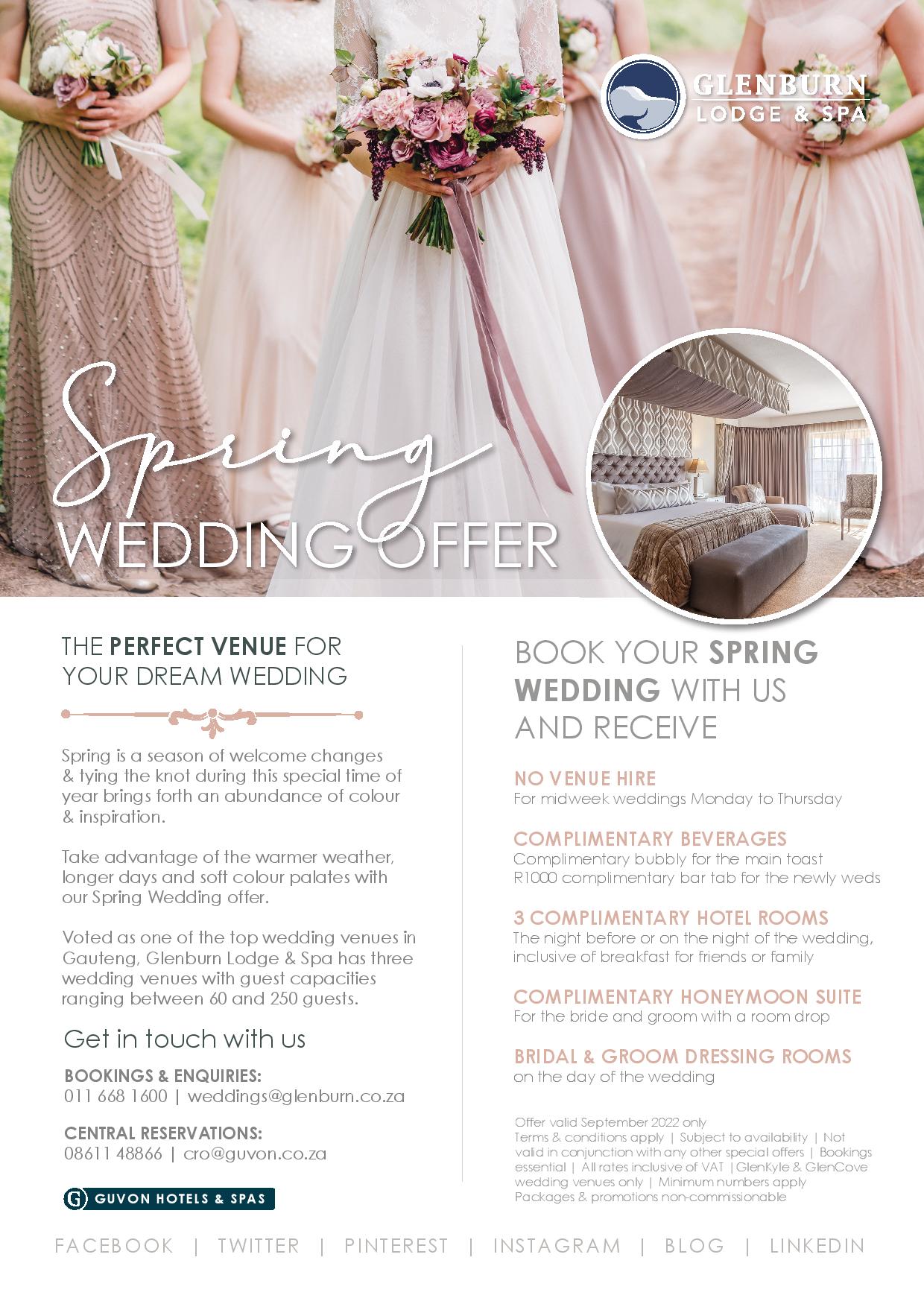 BOOKINGS & ENQUIRIES at 011 668 1600 or weddings@glenburn.co.za.