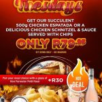 You can choose between a pure beef or chicken cheeseburger with chips and a sauce of your choice all for under R50.