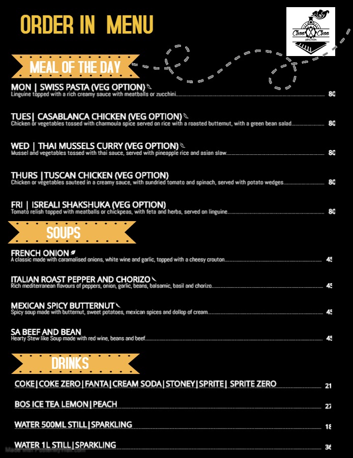 From Monday, Choo Choo Junction will be open and making deliveries in the Linden area with no deliveries fees for those living close by. Any deliveries a little further out will have a R20 (2km) or R30 (3km) applied which will go into the waiters fund.