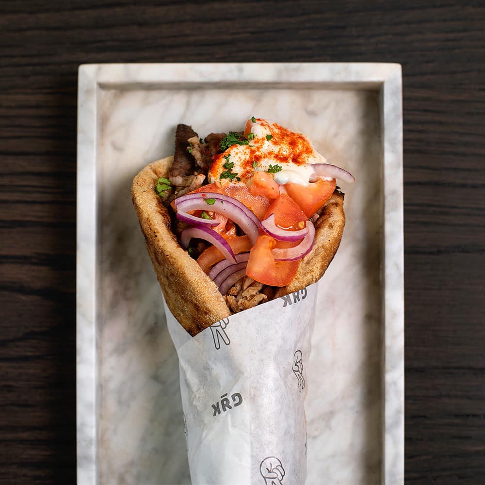 The new method offers a product that is fresher and safer utilising only top-quality meat prepared and grilled on flat grills onsite. The meat is thinly sliced and then cut on open kitchen butcher blocks with custom made half-moon knives, unique to GRK. Although a different take on the traditional gyro, there is no compromise on that punchy gyro flavour. This method of cooking is cleaner and more sanitary offering discerning diners great tasting food, in a modern, upmarket, yet casual setting.
