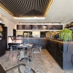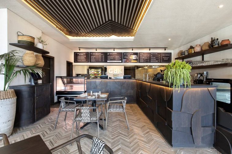 The contemporary setting of GRK is largely made up of custom coloured Herringbone Wolkberg tiles, which appear on both the floor and walls, mirroring the geometric wooden detail that stretches across the ceiling above, as well as an upholstery print which is a modern take on a Greek mosaic. Inspired by Greek art forms, a focal point is the organic shaped bar counter detail and the symmetrical, modular wall panel placed perfectly at the back of the arched seating booths.