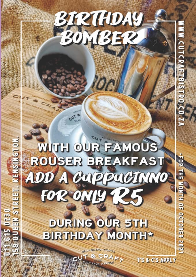 Add a cappuccino for only R5 with your Rouser Breakfast.