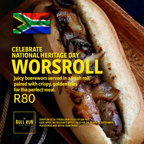 - Available exclusively at The Bull Run, this special offer provides a flavorful tribute to National Heritage Day. Whether you’re enjoying a casual lunch with friends or treating yourself to a hearty dinner, this Wors Roll is the ideal choice to honor the rich culinary traditions of South Africa.