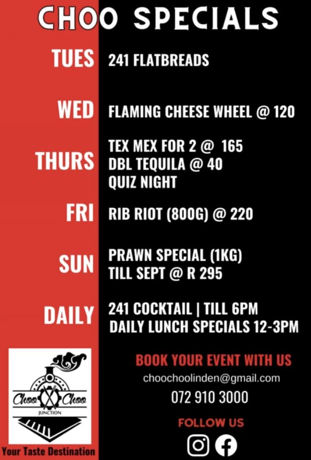 - As if that weren’t enough, Choo Choo Junction is also offering a sumptuous Prawn Special every Sunday until September. For just R295, you can relish a generous 1kg serving of succulent prawns that have been expertly prepared to perfection. Delight in the freshness and succulence of these oceanic gems while soaking up the vibrant ambiance of this renowned eatery.