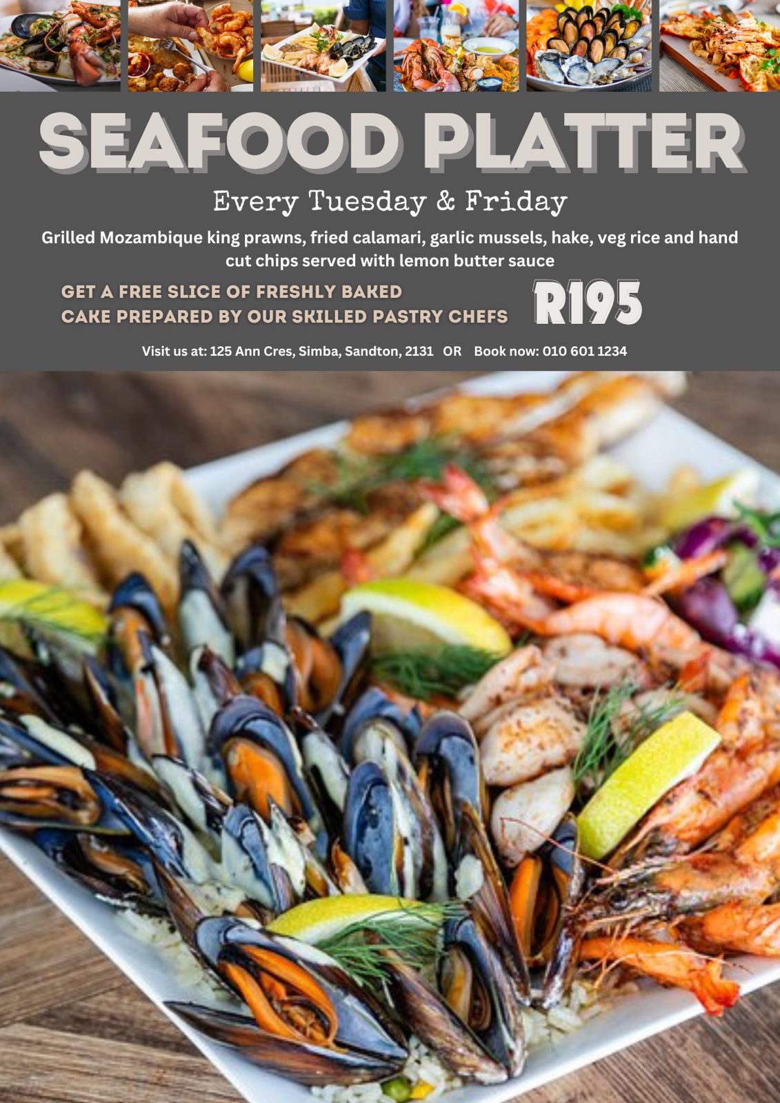 This culinary delight features an enticing selection of grilled Mozambique king prawns, crispy fried calamari, succulent garlic mussels, and tender hake, served alongside fragrant vegetable rice and hand-cut chips.