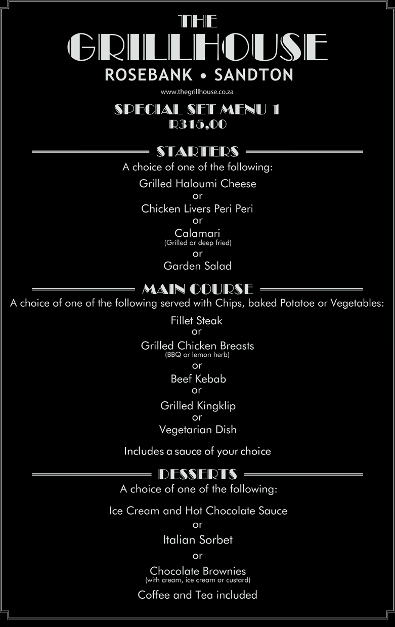 Welcome to The Grillhouse, Johannesburg’s most loved and well established premium steakhouse. Established in 1995, The Grillhouse offers the perfect quadfecta in dining – great food, a huge selection of fine wines and malts, stellar service and an upmarket yet warm and hospitable atmosphere.