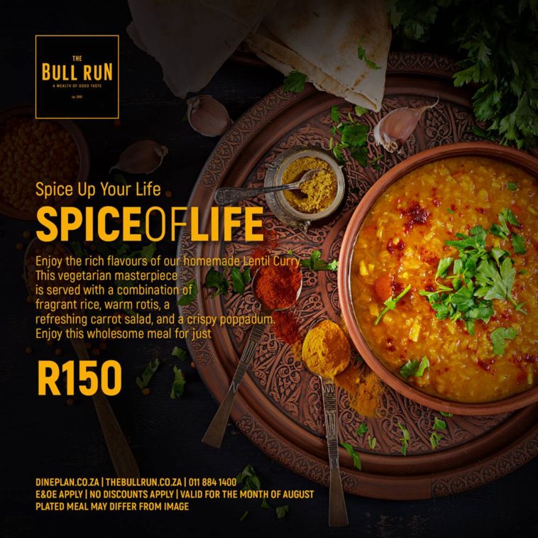 This homemade lentil curry is crafted with care, featuring a medley of lentils cooked to perfection in a blend of aromatic spices available for R150 available at The Bull Run.